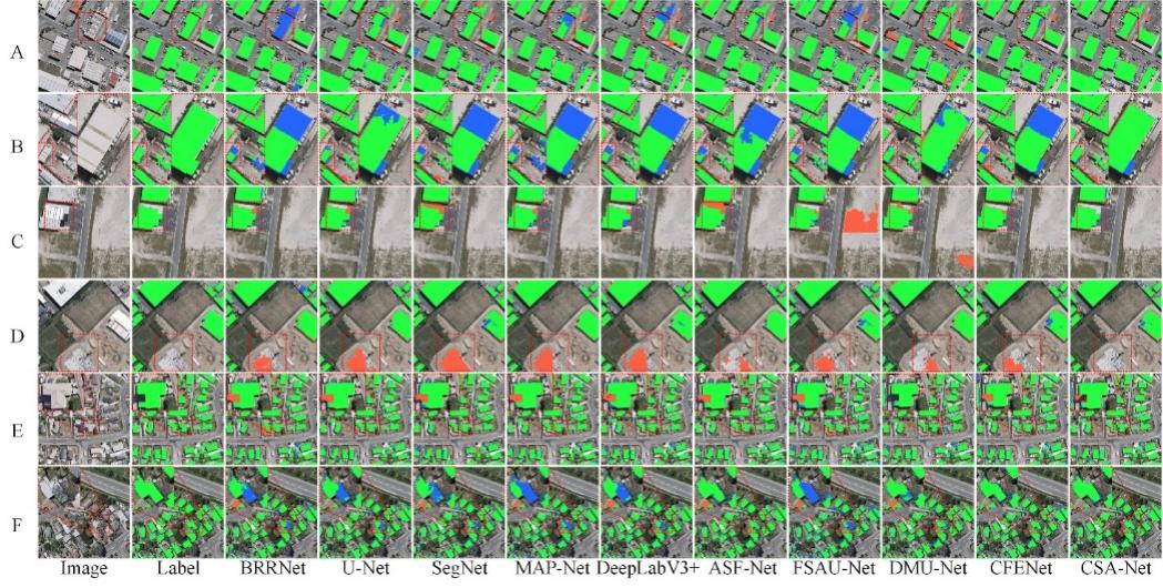 图 2 在WHU数据集上进行的十种方法的视觉比较。图中绿色代表TP,红色代表FP,蓝色代表FN