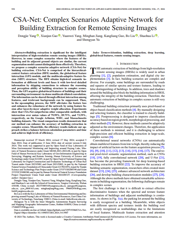 VSport杨栋杰博士在郭康良教授和高贤君副教授的指导下,在成像科学和摄影技术主流期刊《IEEE JOURNAL OF SELECTED TOPICS IN APPLIED EARTH OBSERVATIONS AND REMOTE SENSING》上发表题为“CSA-Net: Complex Scenarios Adaptive Network for Building Extraction for Remote Sensing Images”的研究论文。