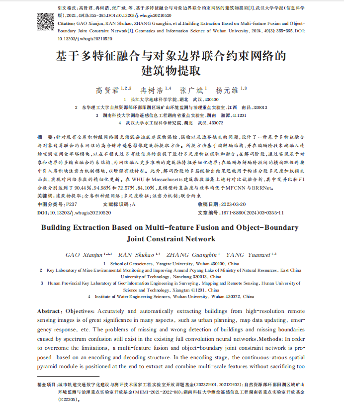 VSport高贤君副教授在遥感领域主流期刊《武大学报》上发表题为“基于多特征融合与边界联合约束网络的建筑物提取”的研究论文。