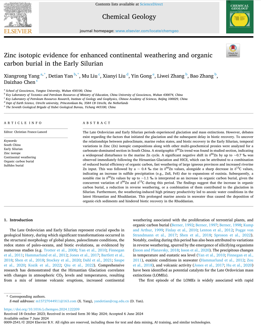 VSport地质系教师杨向荣在地学TOP期刊《Chemical Geology》上发表题为“Zinc isotopic evidence for enhanced continental weathering and organic carbon burial in the Early Silurian”的研究论文。