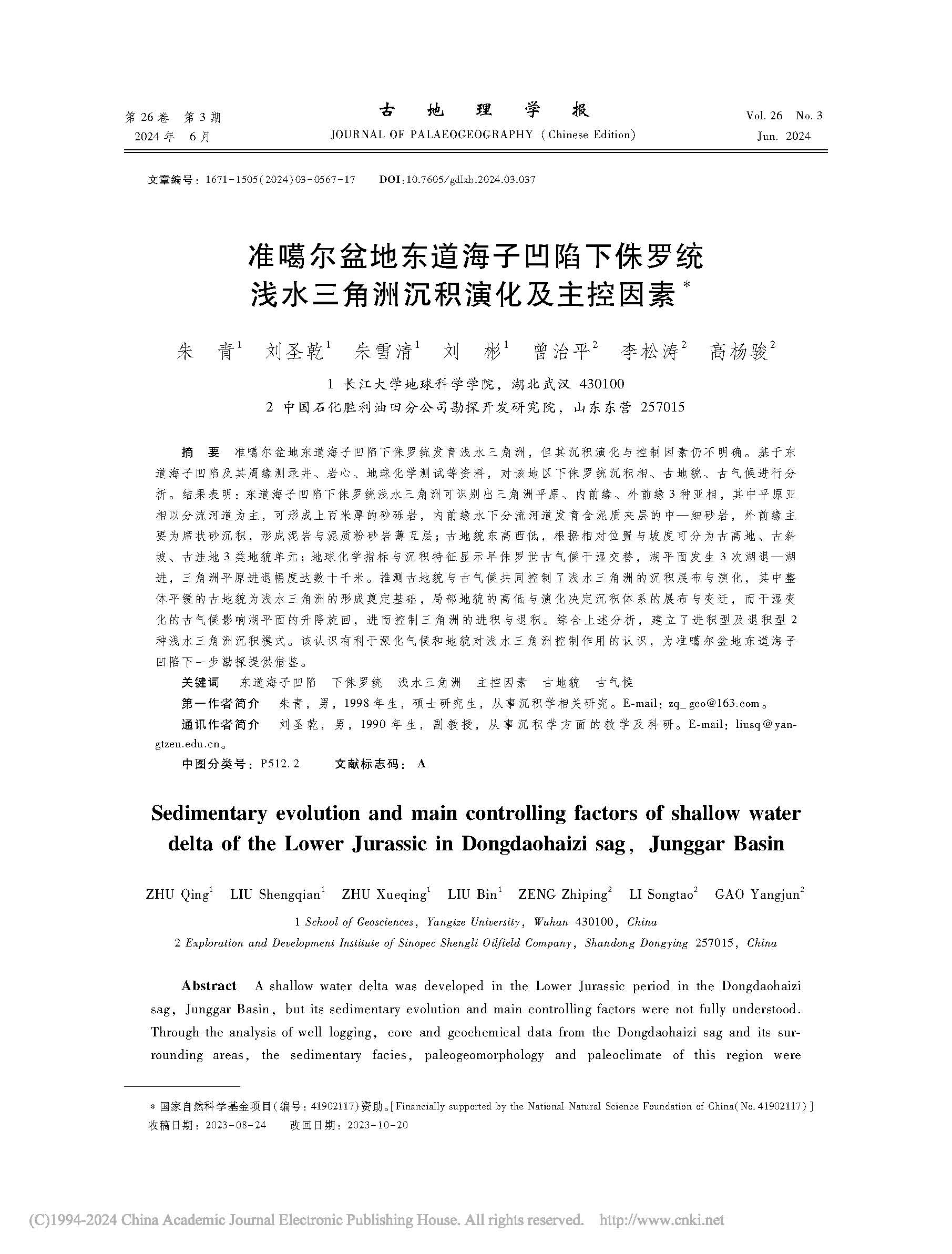VSport地质学专业22级硕士研究生朱青、朱雪清等在《古地理学报》上发表题为“准噶尔盆地东道海子凹陷下侏罗统浅水三角洲沉积演化及主控因素”的研究论文。VSport为论文第一署名单位,研究生朱青为论文第一作者,刘圣乾副教授为论文通讯作者,论文得到了国家自然科学基金项目的资助。