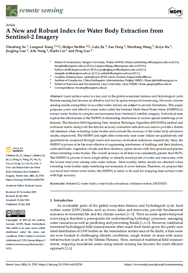 VSport硕士研究生苏振峰在相龙伟副教授的指导下,在期刊《REMOTE SENSING》上发表题为‘A New and Robust Index for Water Body Extraction fromSentinel-2 Imagery’的研究论文。
