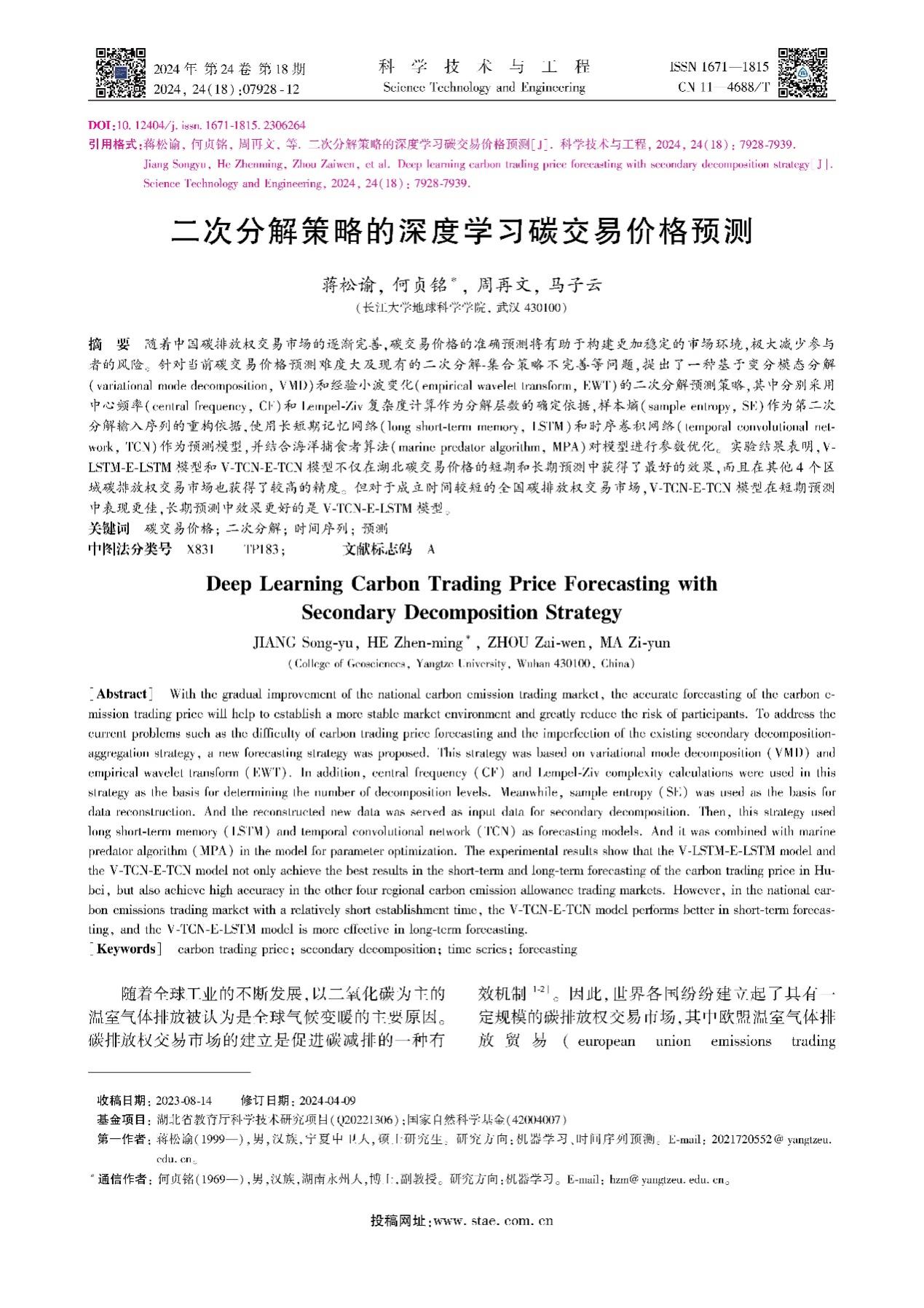 VSport何贞铭副教授团队长期从事GIS、RS应用的研究,团队成员蒋松渝在中文核心期刊《科学技术与工程》上发表题为“二次分解策略的深度学习碳交易价格预测”的研究论文。VSport为论文第一署名单位,硕士研究生蒋松渝为论文第一作者,其导师何贞铭副教授为该文通讯作者。在导师严格要求及编辑耐心帮助下取得该成果。