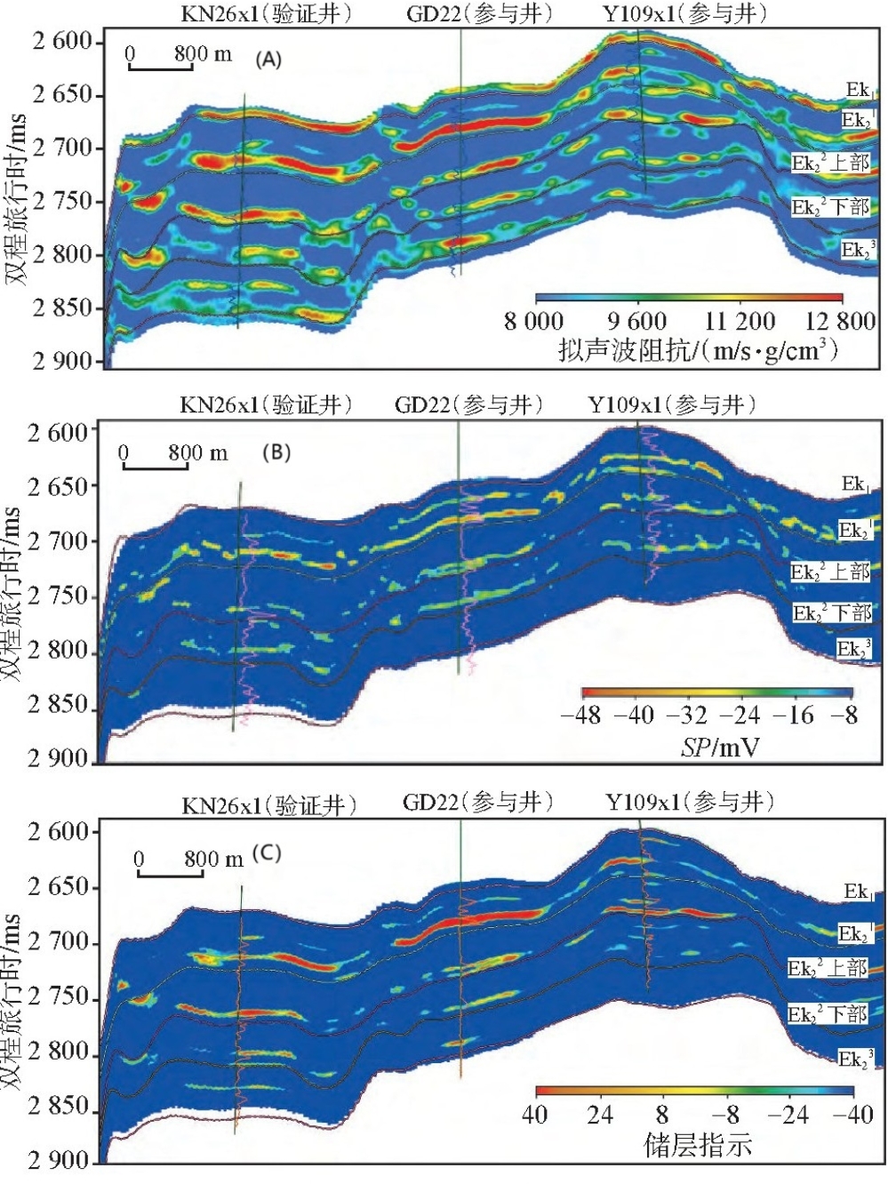 图2(A)黄骅坳陷沧东凹陷南部中高斜坡区古近系孔二段砂体反演连井剖面图;(B)黄骅坳陷沧东凹陷南部中高斜坡区古近系孔二段储层模拟连井剖面图;(C)黄骅坳陷沧东凹陷南部中高斜坡区古近系孔二段储层反演与模拟相结合的连井剖面图