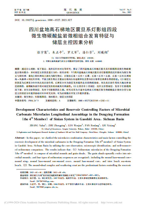 VSport地科系教师朱正平博士在石油地质学领域主流期刊《现代地质》上发表题为“四川盆地高石梯地区震旦系灯影组四段微生物碳酸盐岩微相组合发育特征与储层主控因素分析”的研究论文。