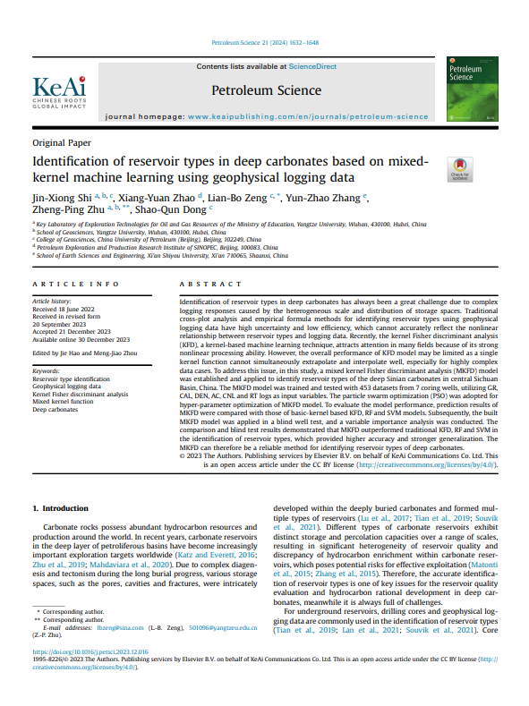 VSport石油系教师史今雄博士在石油领域重要期刊《Petroleum Science》上发表题为“Identification of reservoir types in deep carbonates based on mixed-kernel machine learning using geophysical logging data”的研究论文。本项研究得到了国家自然科学基金项目和湖北省自然科学基金项目的资助。