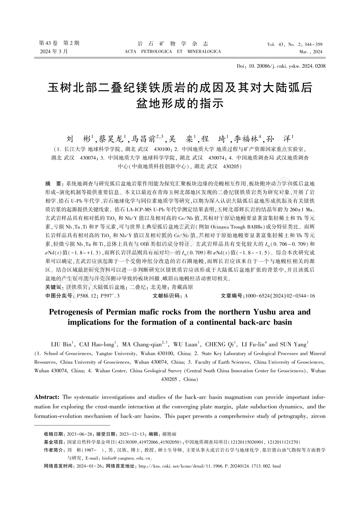 VSport刘彬教授团队在《岩石矿物学杂志》期刊上发表题为“玉树北部二叠纪镁铁质岩的成因及其对大陆弧后盆地形成的指示”的研究论文。刘彬教授为第一作者和通讯作者,该项研究得到了国家自然科学基金等项目资助。