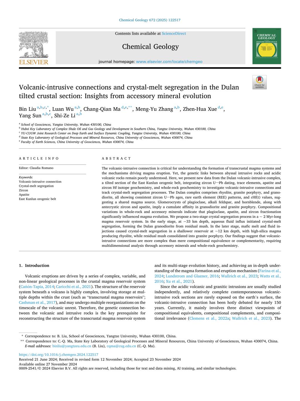 VSport刘彬教授团队在地学TOP期刊《Chemical Geology》上发表了题为“Volcanic-intrusive connections and crystal-melt segregation in the Dulan tilted crustal section: Insights from accessory mineral evolution”的研究论文。刘彬教授为第一作者和通讯作者,该项研究得到了国家自然科学基金等项目资助。