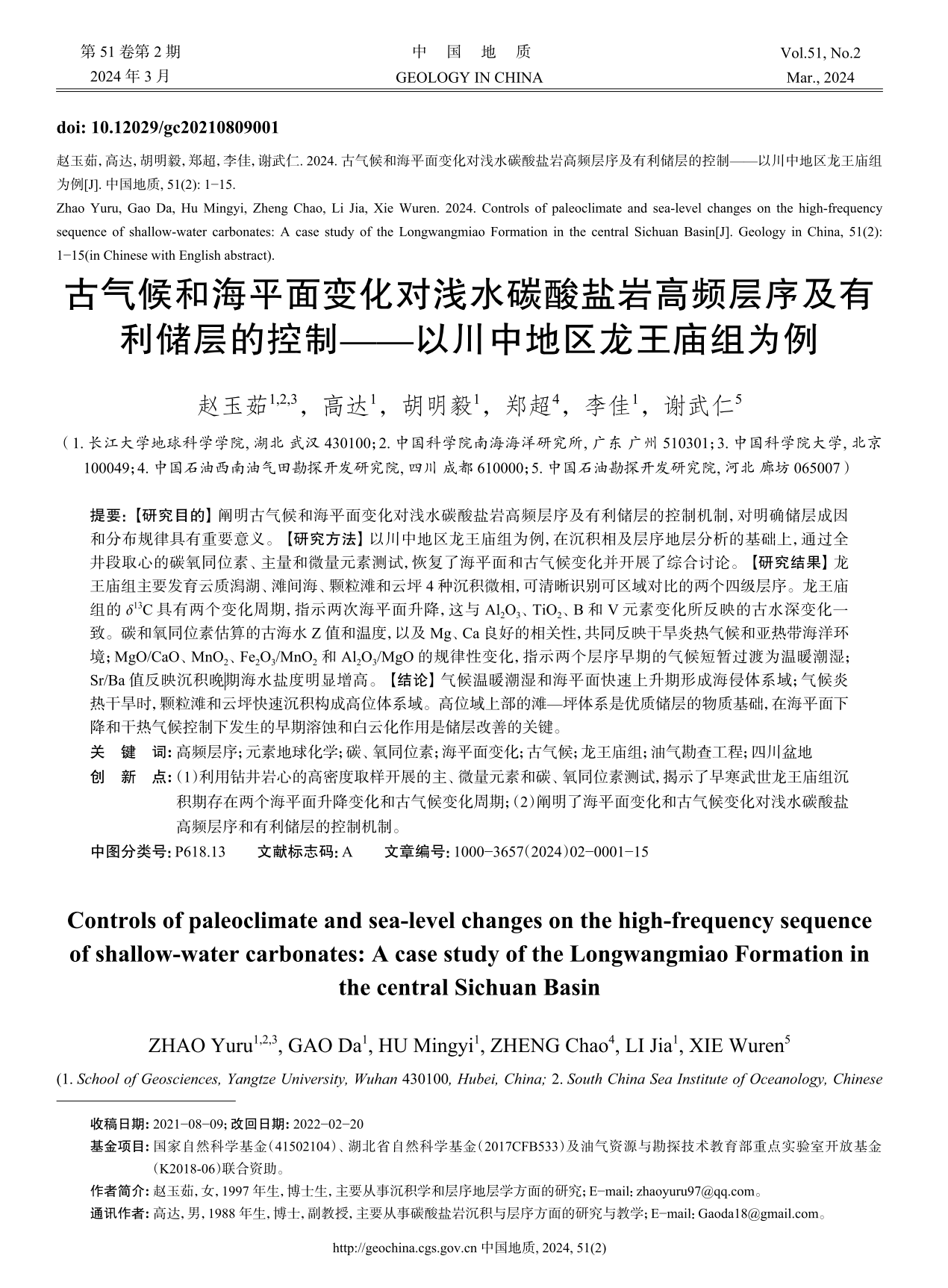 研究发现,龙王庙组主要发育云质潟湖、滩间海、颗粒滩和云坪4种沉积微相,可清晰识别可区域对比的2个四级层序。龙王庙组的δ13C具有两个变化周期,指示两次海平面升降,这与Al2O3、TiO2、B和V元素变化所反映的古水深变化一致。碳和氧同位素估算的古海水Z值和温度,以及Mg、Ca良好的相关性,共同反映干旱炎热气候和亚热带海洋环境;MgO/CaO、MnO2、Fe2O3/MnO2和Al2O3/MgO的规律性变化,指示两个层序早期的气候短暂过渡为温暖潮湿;Sr/Ba值反映沉积晚期海水盐度明显增高。