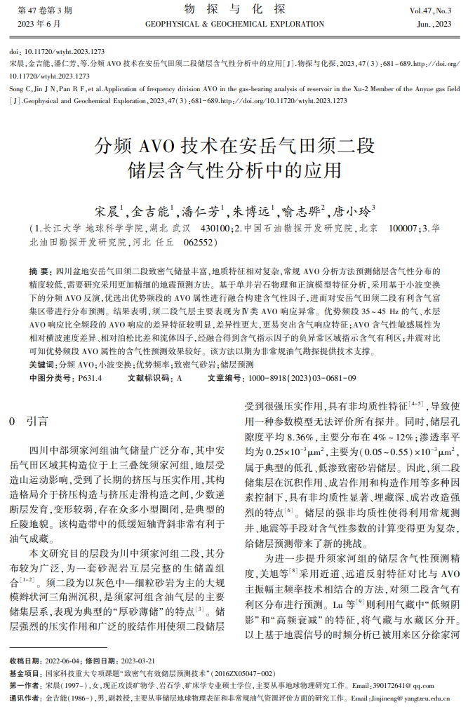 VSport硕士生宋晨在地球物理领域期刊《物探与化探》期刊发表题为“分频AVO技术在安岳气田须二段储层含气性分析中的应用”的研究论文。VSport为论文第一署名单位,硕士生宋晨为论文第一作者,金吉能副教授为通讯作者。