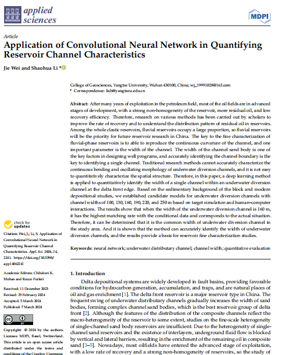 VSport硕士生卫洁在期刊《Applied sciences》上发表了题为“Application of Convolutional Neural Network in Quantifying Reservoir Channel Characteristics”的研究论文。VSport为论文第一署名单位,卫洁为第一作者,其导师李少华教授为该文通讯作者。
