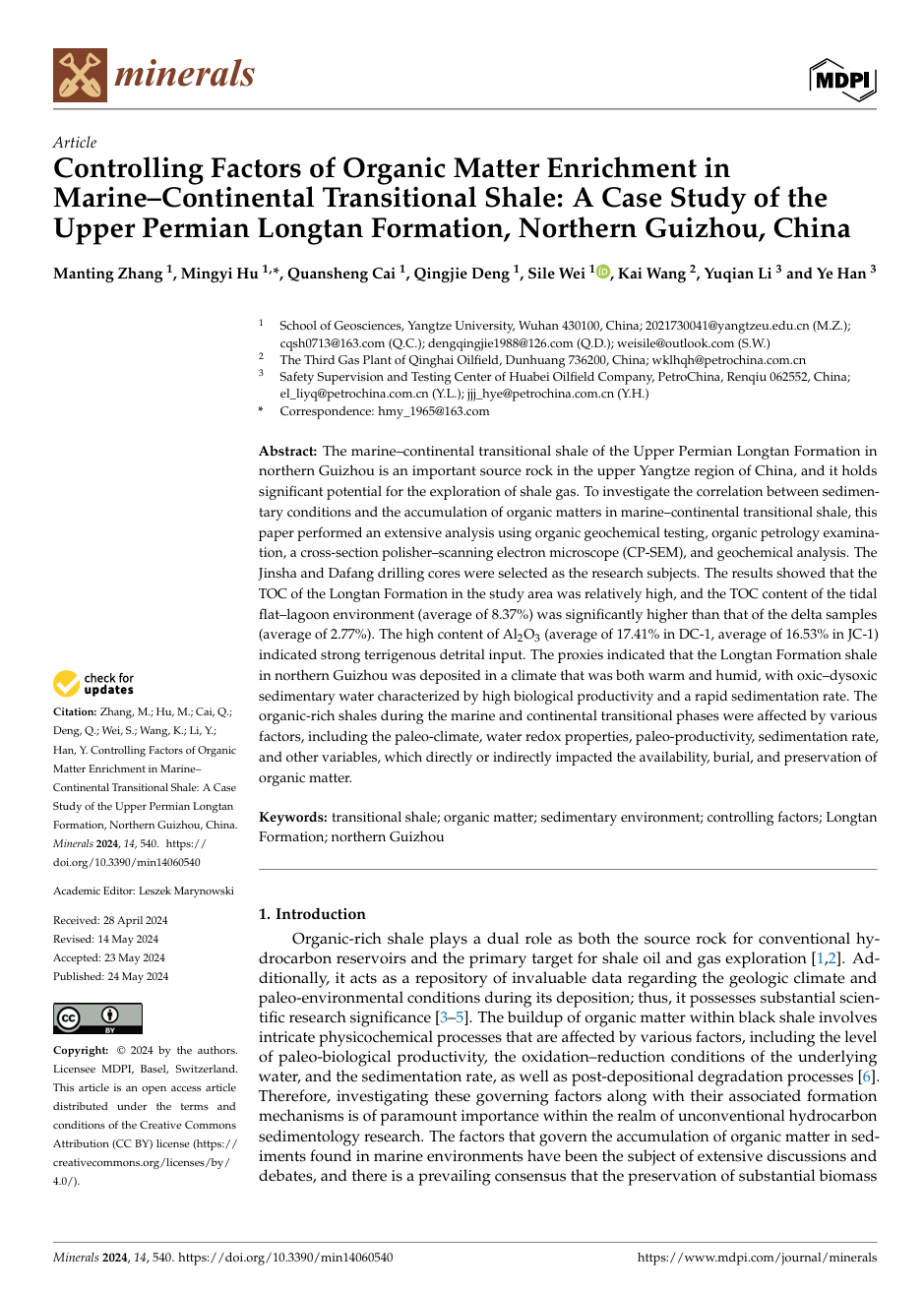 VSport地质系胡明毅教授团队长期从事储层沉积学及页岩气资源评价等方向的研究。团队成员张曼婷博士在期刊《Minerals》上发表题为《Controlling Factors of Organic Matter Enrichment in Marine–Continental Transitional Shale: A Case Study of the Upper Permian Longtan Formation, Northern Guizhou, China》的研究论文,VSport为论文第一署名单位,博士生张曼婷为论文第一作者,其导师胡明毅教授为该文通讯作者。