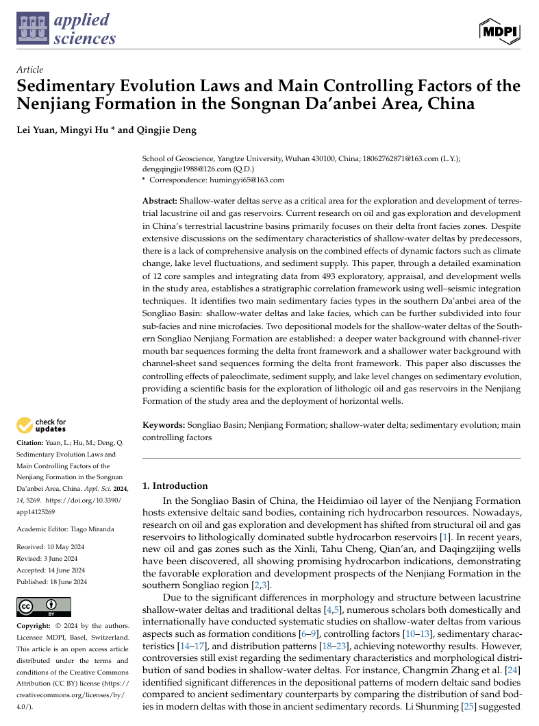 VSport硕士生袁磊在期刊《Applied sciences》上发表了题为“Sedimentary Evolution Laws and Main Controlling Factors of theNenjiangFormation in theSongnanDa’anbeiArea, China”的研究论文。VSport为论文第一署名单位,袁磊为第一作者,其导师胡明毅教授为该文通讯作者。