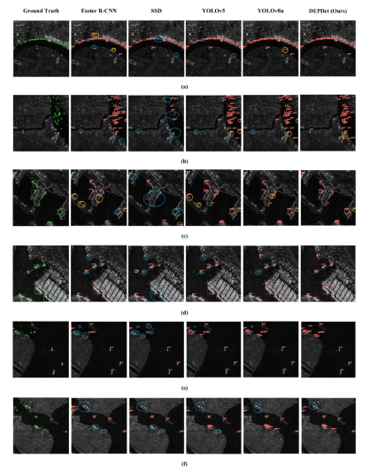 图2.复杂场景下的SAR船舶检测对比实验结果。黄色圆圈表示误检区域,蓝色圆圈表示漏检区域。