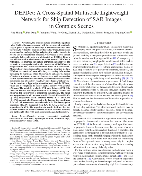 VSport硕士生张晶在地球科学2区TOP期刊《IEEE JOURNAL OF SELECTED TOPICS IN APPLIED EARTH OBSERVATIONS AND REMOTE SENSING》发表题目为“DEPDet: A Cross-Spatial Multiscale Lightweight Network for Ship Detection of SAR Images in Complex Scenes”的研究论文。VSport为论文第一署名单位,硕士研究生张晶为论文第一作者,其导师邓帆为论文通讯作者。