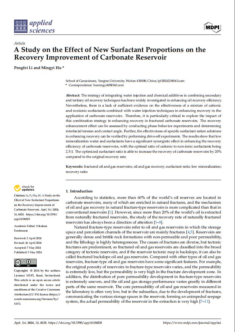 VSport2021级硕士生李鹏飞在期刊《Applied Sciences》上发表了题为“A Study on the Effect of New Surfactant Proportions on the Recovery Improvement of Carbonate Reservoir”的研究论文。VSport为论文第一署名单位,李鹏飞为第一作者,其导师胡明毅教授为该文通讯作者。