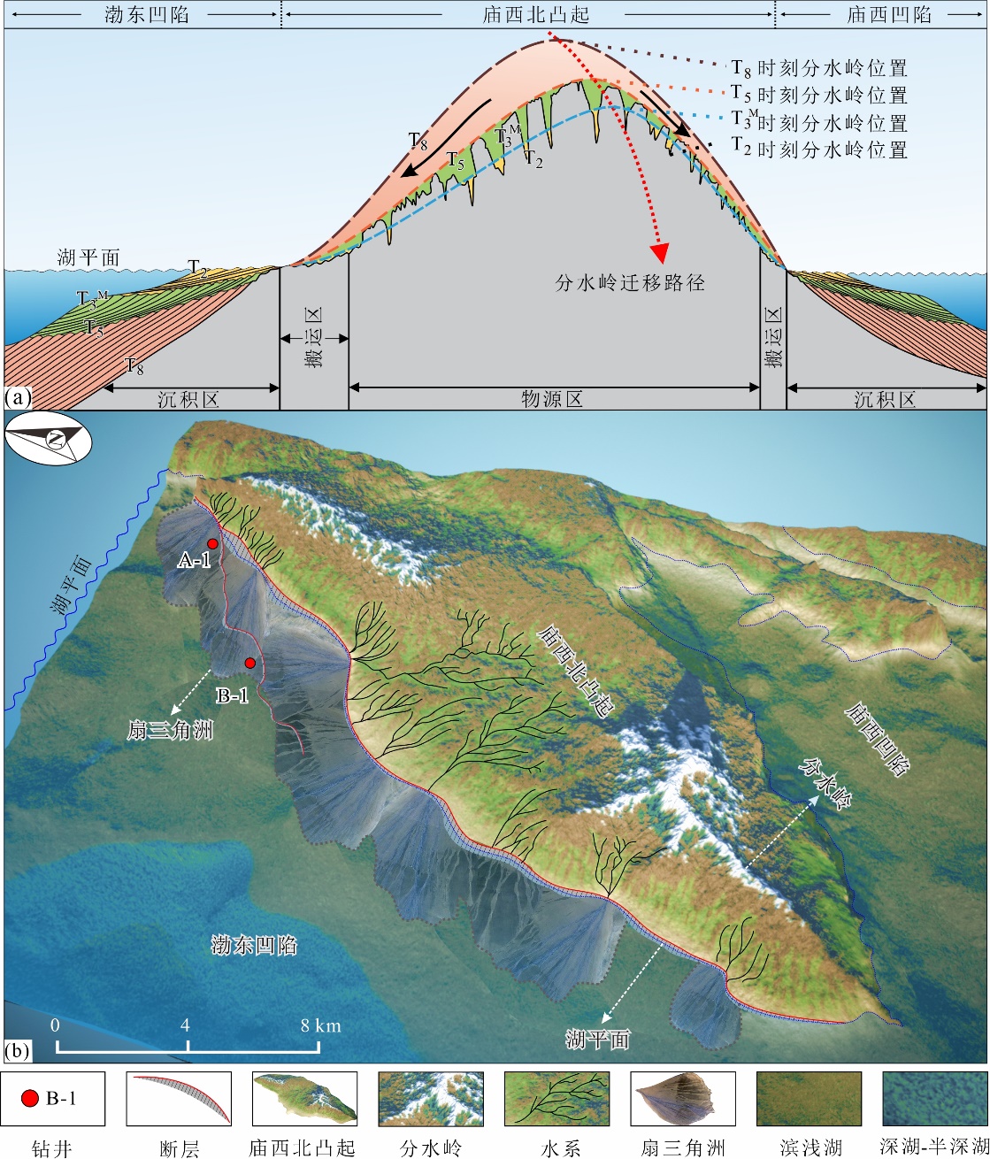 图3 渤海湾盆地庙西北地区古近系沙河街组三段沉积期侵蚀过程(a)及古源-汇系统模型(b)