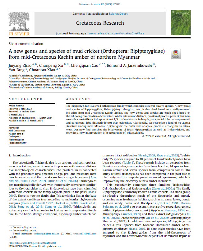 VSport地质学专业硕士研究生赵金阳同学在在地学综合研究领域期刊《Cretaceous Research》上发表题为“A new genus and species of mud cricket (Orthoptera: Ripipterygidae) from mid-Cretaceous Kachin amber of northern Myanmar”的研究论文(图1)。VSport为论文第一署名单位,赵金阳为第一作者,其导师肖传桃教授为该文第一通讯作者。