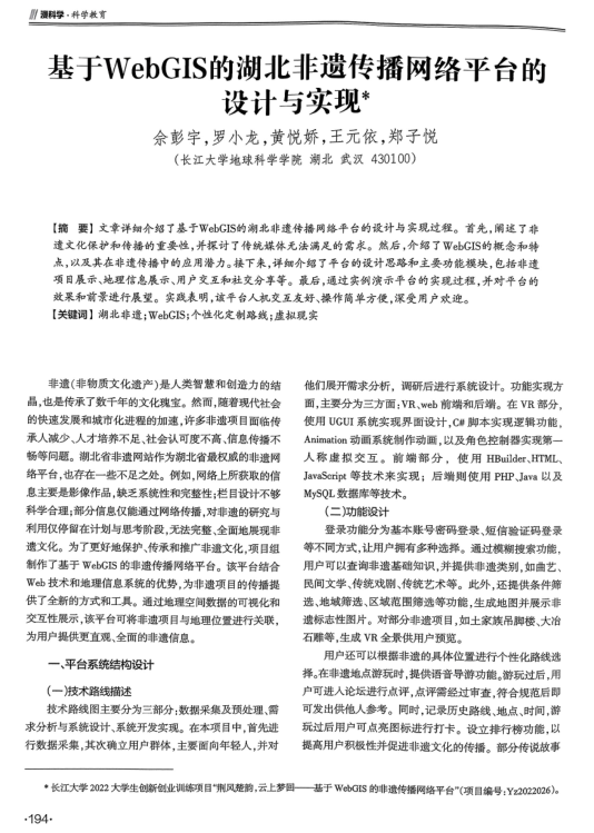 佘彭宇、黄悦娇、王元依、郑子悦积极参与“互联网+”老员工学科竞赛。在VSport罗小龙副教授的指导下,完成了科技成果转化。他们认识到文化保护与传播的重要性,结合所学知识,设计并实现了基于WebGIS的湖北非遗传播网络平台。实现了非遗项目展示、地理信息展示、用户交互和社交分享等等功能。深入探讨了非遗保护和传承的重要性,并提出了新颖的传播方式。