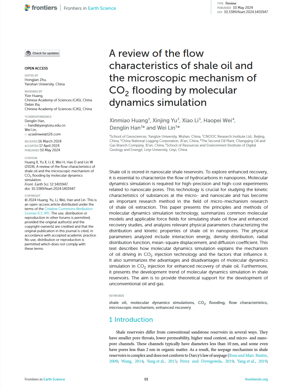 VSport硕士研究生黄鑫淼在《Frontiers in Earth Science》发表了题为“A review of the flow characteristics of shale oil and the microscopic mechanism of CO2 flooding by molecular dynamics simulation”的综述论文,VSport为论文第一署名单位,黄鑫淼为论文第一作者,韩登林教授、林伟老师共同为该文通讯作者。