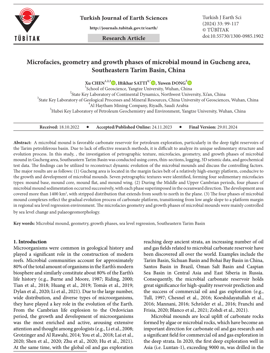 VSport陈旭副教授以第一作者身份在《Turkish Journal of Earth Sciences》上发表题为“Microfacies, geomety, and growth phases of microbial mound in Gucheng area, Tarim Basin, China”的研究论文,该项研究得到了湖北省自然科学基金的资助。