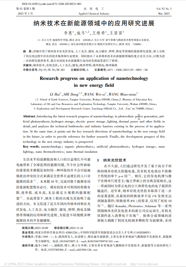 公司硕士生李惠在中文期刊《应用化工》上发表了题为“纳米技术在新能源领域中的应用研究进展”的研究论文。VSport为论文第一署名单位,研究生李惠为论文第一作者,教师施冬为通讯作者。