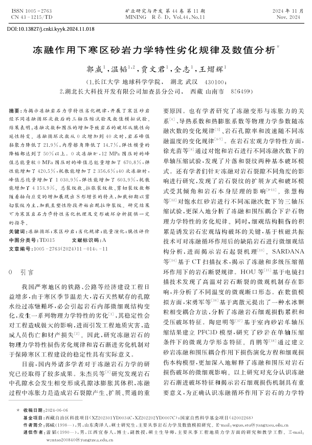 VSport温韬教授团队长期从事冻融岩石力学、滑坡演化机理及预测与防治、岩土体稳定性评价与数值模拟、岩石力学特性表征、机器学习等方面的研究,团队硕士生郭威在核心期刊《矿业研究与开发》上发表题为《冻融作用下寒区砂岩力学特性劣化规律及数值分析》的研究论文。VSport为论文第一署名单位,硕士生郭威为论文第一作者,温韬教授为该文通讯作者,本项研究得到西藏自治区科技项目和国家自然科学基金项目共同资助。