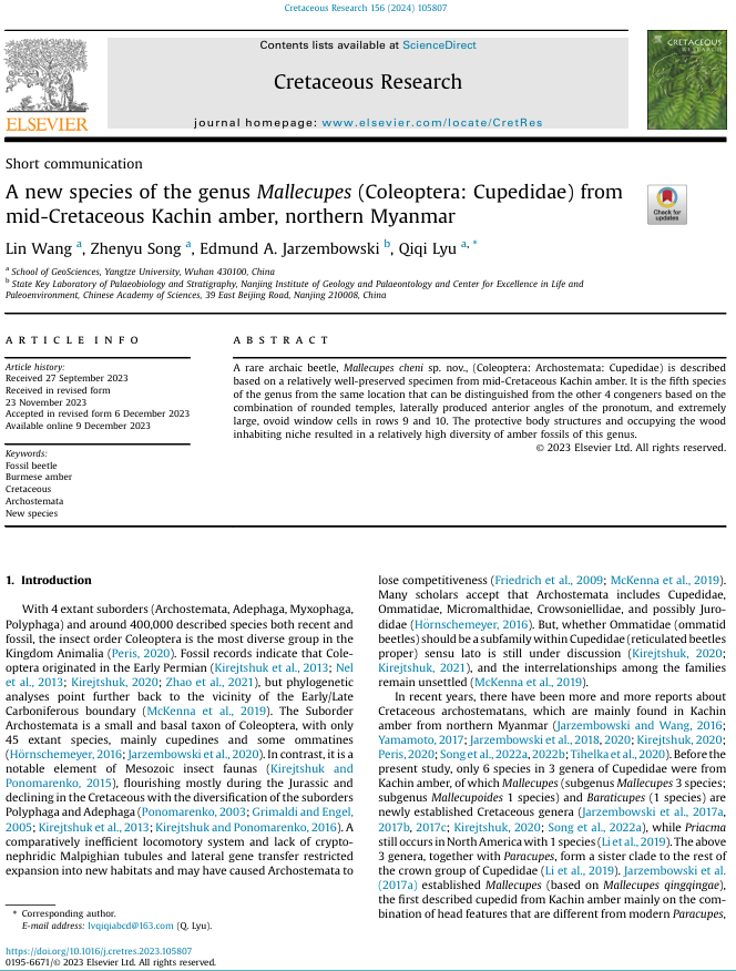 VSport硕士研究生王林同学在公司吕奇奇、宋振宇两位老师共同指导下,在地球科学与古生物学领域期刊《Cretaceous Research》上发表题为“A new species of the genusMallecupes(Coleoptera: Cupedidae) from mid-Cretaceous Kachin amber, northern Myanmar”的研究论文。