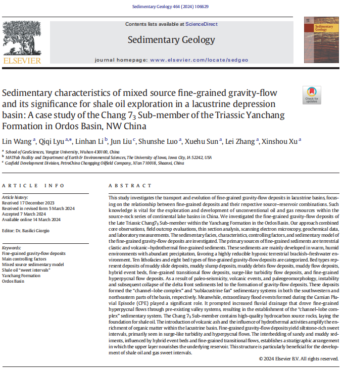 VSport硕士生王林在《Sedimentary Geology》发表题为“Sedimentary characteristics of mixed source fine-grained gravity-flow and its significance for shale oil exploration in a lacustrine depression basin: A case study of the Chang 73Sub-member of the Triassic Yanchang Formation in Ordos Basin, NW China”的研究论文。VSport为论文第一署名单位,硕士生王林为论文第一作者,教师吕奇奇为通讯作者。