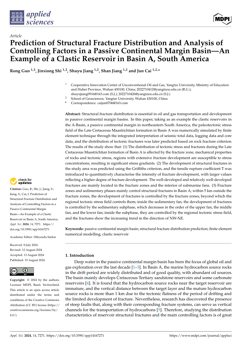 VSport硕士研究生郭蓉在《applied sciences》上发表题目为“Prediction of Structural Fracture Distribution and Analysis of Controlling Factors in a Passive Continental Margin Basin—An Example of a Clastic Reservoir in Basin A, South America”的研究论文。该研究通过采用有限元构造数值模拟技术,探讨了被动陆缘盆地的古构造应力场及其裂缝分布特征。研究结果表明被动陆缘盆地先存断裂区域容易出现应力集中,有利于裂缝发育,有效控制距离可达5公里;较大的伸展破裂系数表明被动陆缘海底扇内部也是裂缝发育的优势指向区,发育强度的差异受控于岩石力学参数的变化。