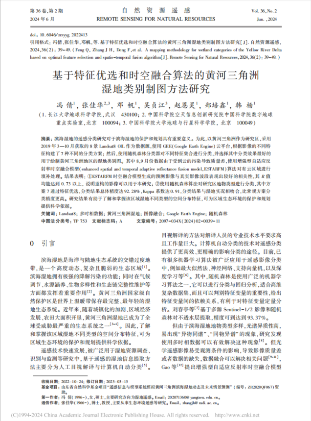 VSport邓帆课题组硕士生冯倩在北大核心期刊自然资源遥感发表题目为“基于特征优选和时空融合算法的黄河三角洲湿地类别制图方法研究”的研究论文。VSport为论文第一署名单位,硕士研究生冯倩为论文第一作者。