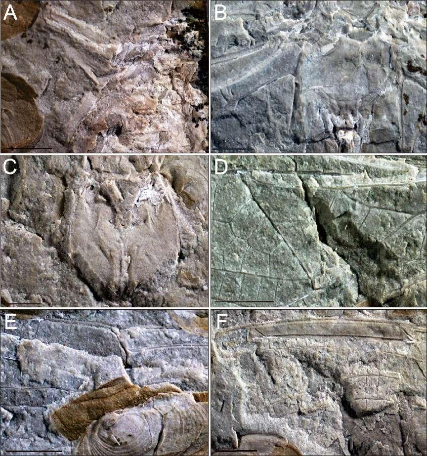 图2 中华梅佩达属局部化石图(A)头部, (B)基部, (C)肛门环, (D)三角室, (E)翅结, (F)翅痣.比例尺= 2 mm.
