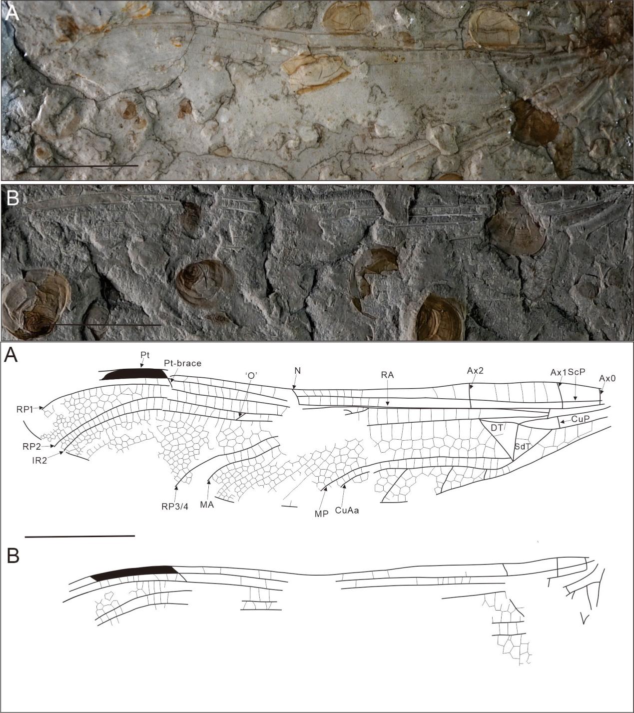 该研究基于来自中国东北内蒙古海防沟组的一个保存完好蜻蜓印痕化石标本为研究对象,利用古生物学、年代与生物地层学等领域的相关成果,确定其来源与时代,同时初步探究了其与部分类群可能的亲缘关系。通过U-Pb锆石定年法确认其时代大致属于中侏罗世(Jurassic)早期,此时期也正是蜻蜓研究的一个重要时期。同时,通过对该标本进行认真详细的镜下观察与描述对比,确认其属于蜻蜓目Odonata类差翅亚目Anisoptera梅佩达科Mesuropetalidae中华梅佩达属Inoderbidae为同一类别,从而将进行重新修订,对Mesuropetalid蜻蜓Sinomesuropetala daohugensis Boudet, Nel & Huang, 2023进行了修订。新标本使我们能够完成该物种前翅的特征,显示了Sinomesuropetala Boudet, Nel & Huang, 2023与Mesuropetala Handlirsch, 1906之间的密切关系(图1)。此标本也是国际上梅佩达科下报道的第10块标本。另外,在该标本中首次发现了部分特征(图2),同时也是在梅佩达科下首次发现。Mesuropetalid蜻蜓目前记录于东亚、东中南欧和南美洲的晚侏罗世和早白垩世沉积物中,表明了这些时期一些基础蜻蜓可能具有广泛的分布和可能的长距离迁徙能力。由此也为解释梅佩达科特征发育和亲缘关系提供了一种新的可能,同时也更好地揭示了侏罗纪时期蜻蜓的生物多样性(图3)。