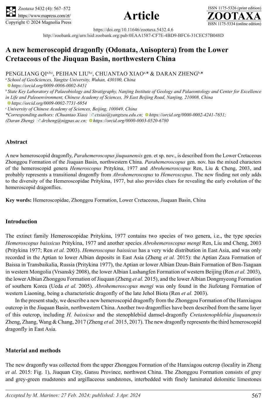 VSport地质资源与地质工程专业硕士生漆鹏亮在在古生物学期刊《ZOOTAXA》上发表题为“A new hemeroscopid dragonfly (Odonata, Anisoptera) from the Lower Cretaceous of the Jiuquan Basin, northwestern China”的研究论文。VSport为论文第一署名单位,漆鹏亮为第一作者,其导师肖传桃教授为第一通讯作者。