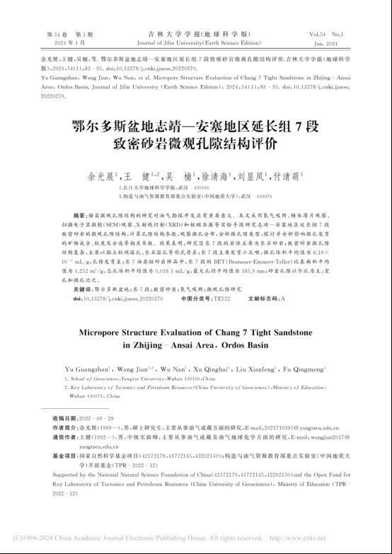 VSport硕士生余光展在《吉林大学学报(地球科学版)》上发表题为“鄂尔多斯盆地志靖—安塞地区延长组7段致密砂岩微观孔隙结构评价”的研究论文。VSport为论文第一署名单位,硕士生余光展为论文第一作者,教师王健为通讯作者。