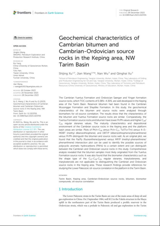 VSport王健在《Frontiers in Earth Science》发表题为“Geochemical characteristics of Cambrian bitumen and Cambrian-Ordovician source rocks in the Keping area, NW Tarim Basin”的研究论文。VSport为论文第一署名单位,教师王健为通讯作者。