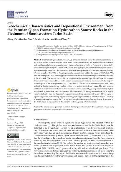 VSport吴琼博士以第一作者身份在《Applied Sciences》上发表题为“Geochemical Characteristics and Depositional Environment from the Permian Qipan Formation Hydrocarbon Source Rocks in the Piedmont of Southwestern Tarim Basin”的研究论文,VSport为论文第一署名单位,吴琼为论文第一作者,导师王振奇为通讯作者。