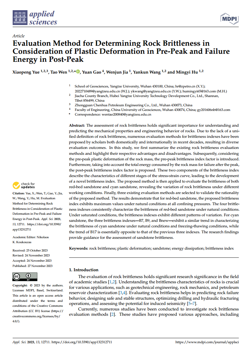 VSport岳晓朋在《Applied Sciences-Basel》上发表题为“Evaluation Method for Determining Rock Brittleness in Consideration of Plastic Deformation in Pre-Peak and Failure Energy in Post-Peak”的研究论文。VSport为论文第一署名单位,研究生岳晓朋为论文第一作者,温韬教授为通讯作者。