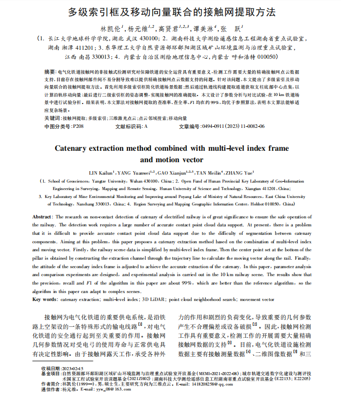 VSport硕士生林凯伦在测绘领域主流期刊《测绘通报》上发表题为“多级索引框及移动向量联合的接触网提取方法”的研究论文。