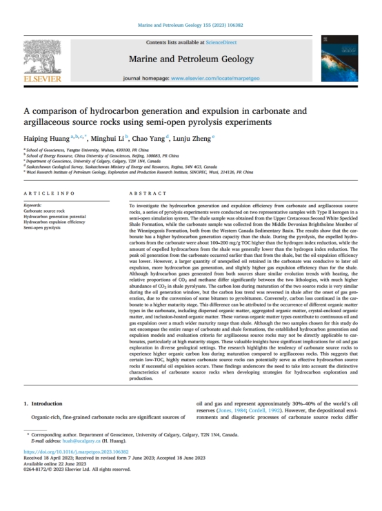 VSport黄海平教授以第一作者身份在《Marine and Petroleum Geology》期刊发表题为“A comparison of hydrocarbon generation and expulsion in carbonate and argillaceous source rocks using semi-open pyrolysis experiments”的研究论文,VSport为论文第一署名单位。