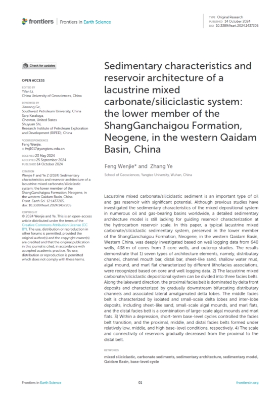 VSport教师冯文杰在《Frontiers in Earth Science》上发表题为“Sedimentary characteristics and reservoir architecture of a lacustrine mixed carbonate/siliciclastic system: the lower member of the ShangGanchaigou Formation, Neogene, in the western Qaidam Basin, China”的研究论文。该论文针对柴达木盆地西部地区新近系上干柴沟组下段混积体系开展野外露头无人机倾斜摄影建模与解剖、地下储层表征,明确了油田开发尺度下,混积体系沉积特征与沉积模式。