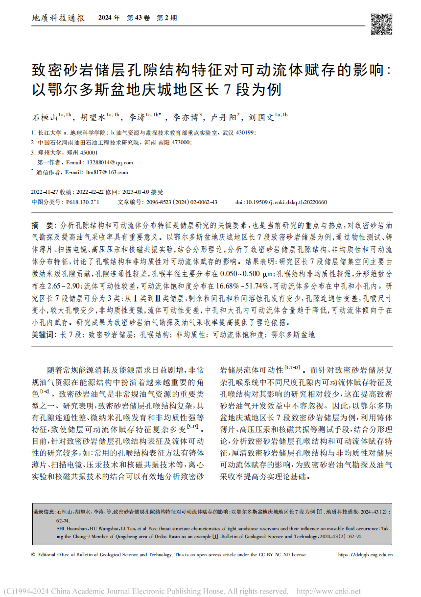 VSport博士生石桓山在期刊《地质科技通报》上发表题为“致密砂岩储层孔隙结构特征对可动流体赋存的影响:以鄂尔多斯盆地庆城地区长7段为例”的研究论文。VSport为论文第一署名单位,李涛教授为通讯作者。