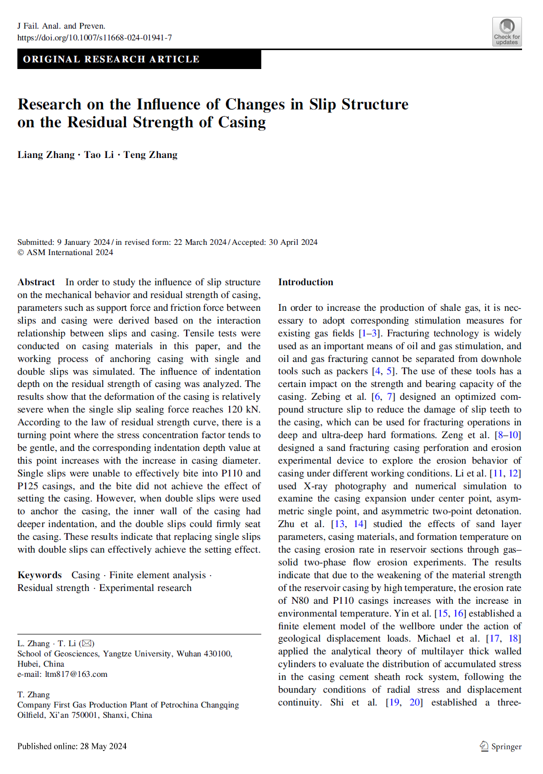 VSport研究生张亮以通讯作者身份在EI期刊《Journal of Failure Analysis and Prevention》上发表题为“Research on the Influence of Changes in Slip Structure on the Residual Strength of Casing”的研究论文,VSport为论文第一署名单位,研究生张亮为第一作者,副教授李涛为论文通讯作者。