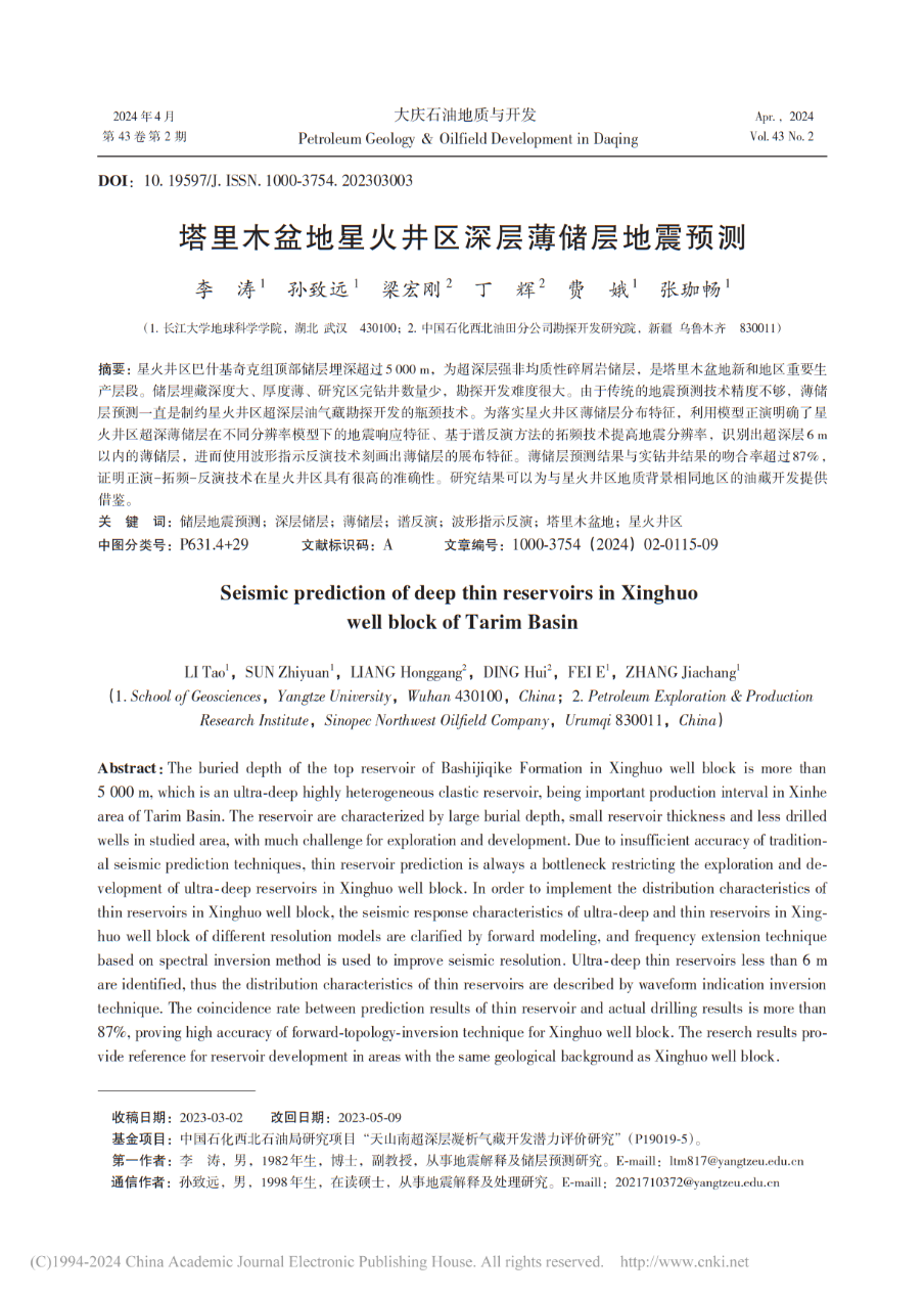 VSport研究生孙致远以通讯作者身份在北大核心期刊《大庆石油地质与开发》上发表题为“塔里木盆地星火井区深层薄储层地震预测”的研究论文,VSport为论文第一署名单位。副教授李涛为第一作者,研究生孙致远为论文通讯作者。