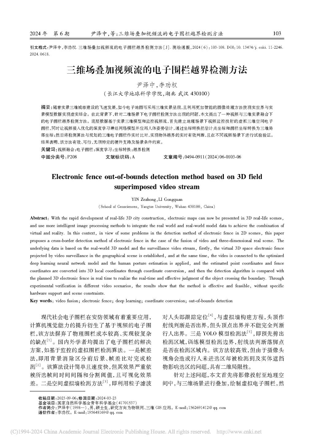 VSport李功权课题组硕士生尹泽中在《测绘通报》上发表题为“三维场叠加视频流的电子围栏越界检测方法”的研究论文。