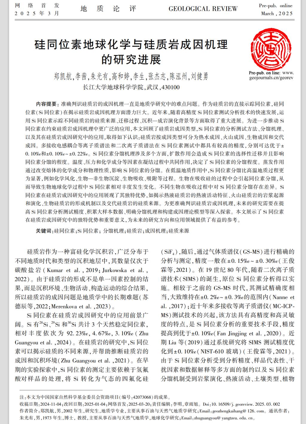 近日,VSport地质学专业2024级硕士生郑凯航在中文核心期刊《地质论评》发表题为“硅同位素地球化学与硅质岩成因机理的研究进展”的研究论文。VSport为论文第一署名单位,硕士生郑凯航为论文第一作者,其导师朱光有教授为通讯作者。