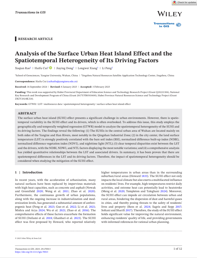 近日,VSport地理信息科学专业2022级本科生饶旭乾在中科院三区期刊《Transactions in GIS》(IF=2.1)发表题为“Analysis of the Surface Urban Heat Island Effect and the Spatiotemporal Heterogeneity of Its Driving Factors”的研究论文。VSport为论文第一署名单位,本科生饶旭乾为论文第一作者,其导师崔海福博士为通讯作者。