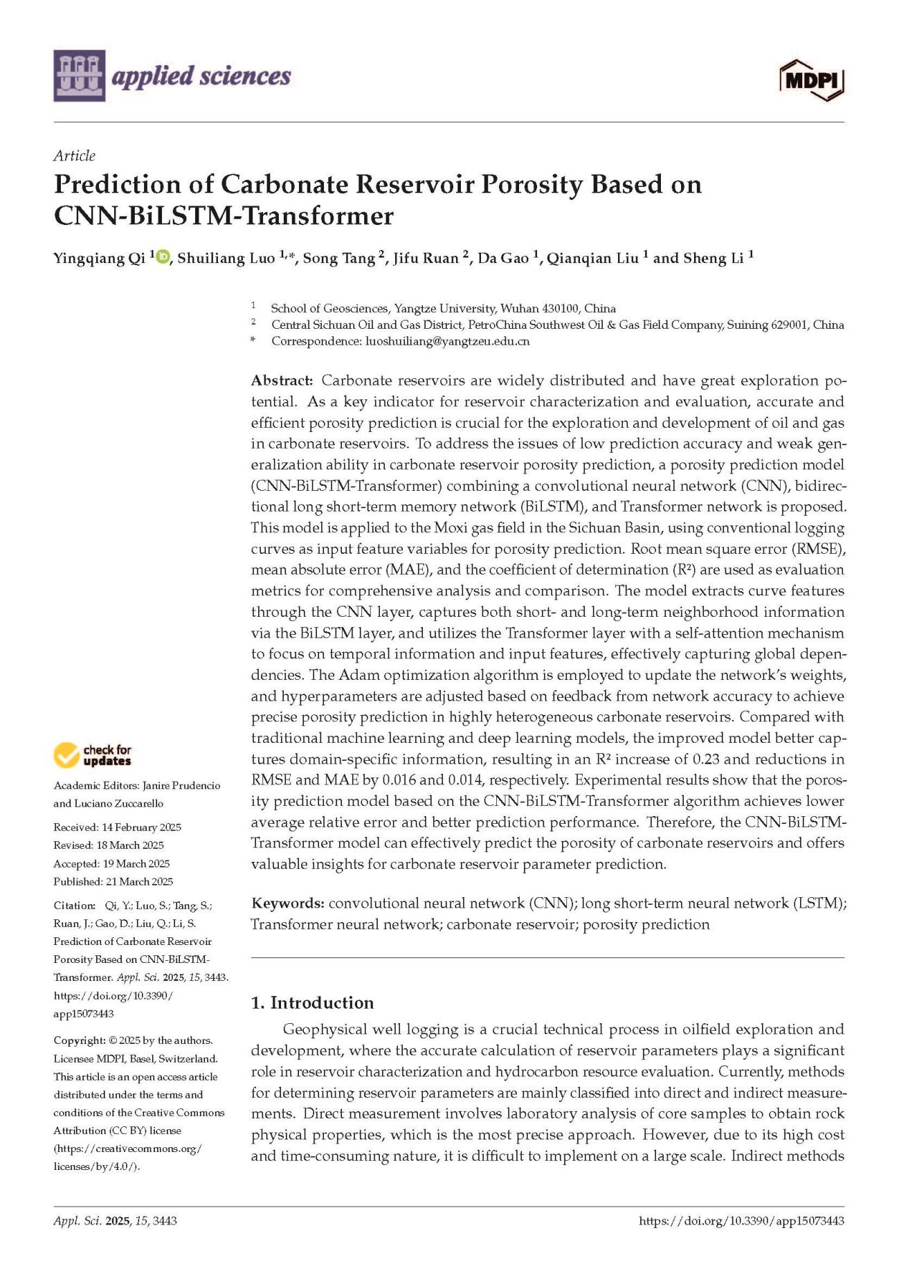 VSport硕士生漆影强在SCI收录期刊《Applied Sciences》上发表题为“Prediction of Carbonate Reservoir Porosity Based on CNN-BiLSTM-Transformer”的研究论文。VSport为论文第一署名单位,罗水亮副教授为第一通讯作者,论文由中国青年基金国家自然科学基金项目资助。