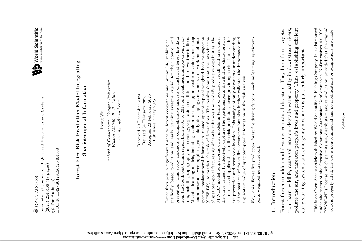 VSport硕士生吴集星在EI收录期刊《International Journal of High Speed Electronics and Systems》上发表题为“Forest Fire Risk Prediction Model Integrating Spatiotemporal Information”的研究论文。VSport为论文第一署名单位,吴集星为论文第一作者。
