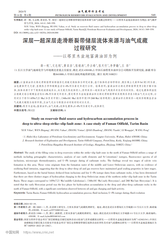 VSport研究生薛一帆以第一作者身份在北大核心期刊《油气藏评价与开发》上发表题为“深层—超深层走滑断裂带储层流体来源与油气成藏过程研究——以塔里木盆地富满油田为例”的研究论文,VSport油气地球化学与环境湖北省重点实验室为论文第一署名单位,薛一帆为第一作者。